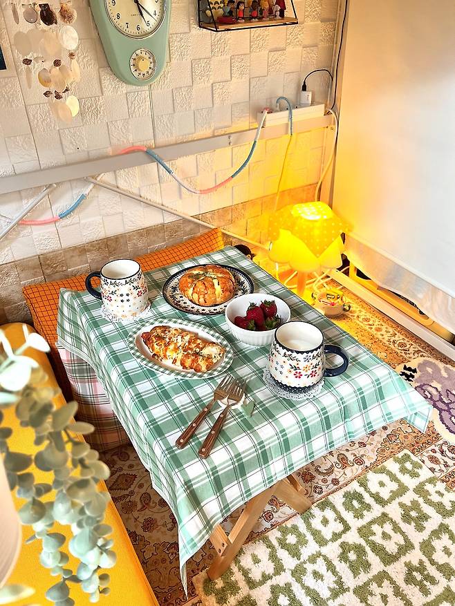 그리고 이 공간은 제가 가장 좋아하는 가구인 노란색의 패브릭 소파를 둔 공간입니다! 소파 등받이에는 꽃 장식이 들어간 블랭킷을 두고 소파 위에 귀여운 쿠션과 인형을 두어 더욱 아기자기한 분위기를 만들었어요.
