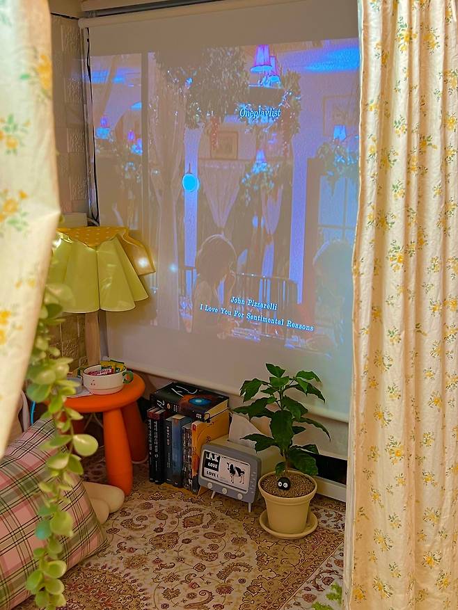그리고 침대 아래쪽으로 커튼을 설치해 조금 더 아늑한 공간을 만들어보았어요. 저는 조명을 켜 두는 걸 좋아하는데 조명을 켜두면 빔프로젝터로 영화를 볼 때 영화가 흐릿하게 보여서 커튼을 쳐두고 안에 들어가서 영화를 봅니다!
