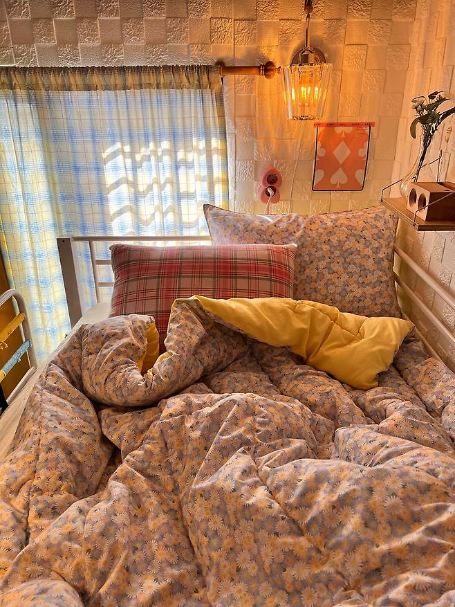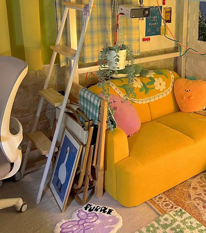 그리고 이 공간은 제가 가장 좋아하는 가구인 노란색의 패브릭 소파를 둔 공간입니다! 소파 등받이에는 꽃 장식이 들어간 블랭킷을 두고 소파 위에 귀여운 쿠션과 인형을 두어 더욱 아기자기한 분위기를 만들었어요.