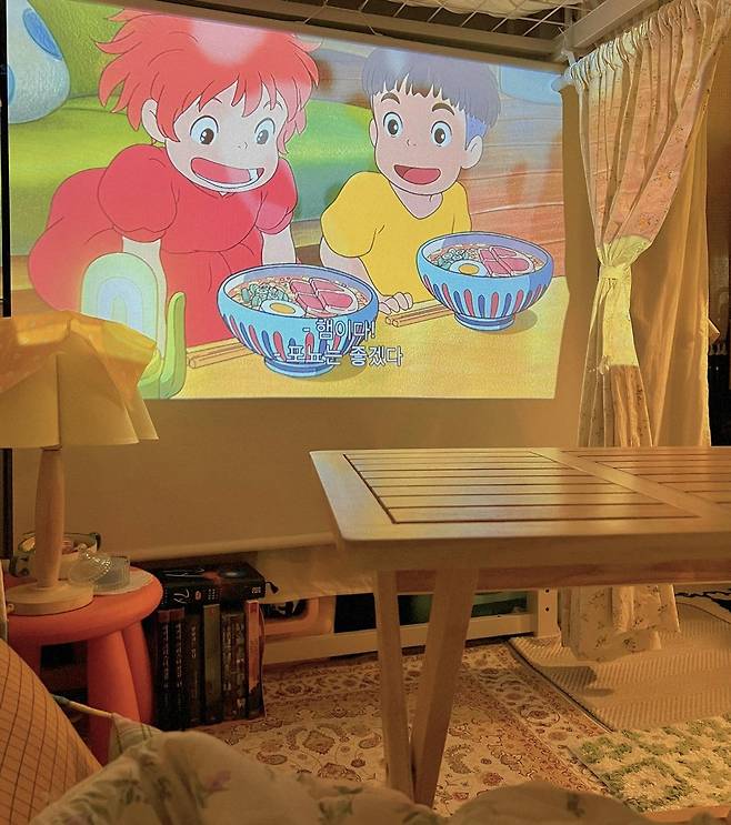 벙커 침대 아래쪽 공간이에요. 아늑하면서 아기자기한 소품을 활용하여 저만의 영화관으로 꾸며보았어요. 러그를 하나만 깔아두지 않고 2종류의 러그와 하나의 발매트를 두어서 더욱 재미를 주었습니다. 방구석 영화관을 만들고 싶어서 침대 밑으로 빔프로젝터와 빔 스크린을 설치해두었어요.