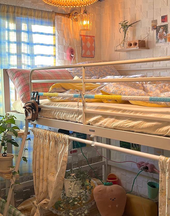 어렸을 때부터 벙커 침대의 로망이 있어서 벙커 침대를 두고 빈티지한 느낌으로 방을 꾸며보았어요. 파워 맥시멀리스트라서 공간의 벽면을 가득 채워봤습니다. 컨셉은 한마디로 '온 세상 색감이 다 있는 아지트'입니다.