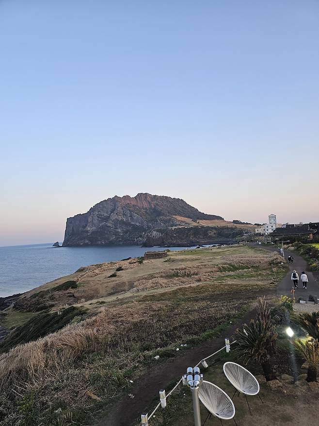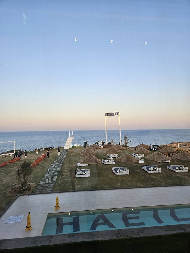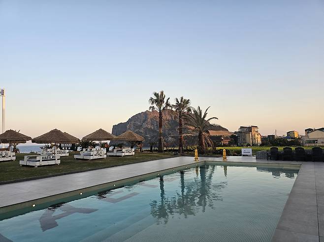 ‘제주 성산일출봉 카페 해일리’는 해 질 녘에 방문하면 더 아름다운 풍경을 선물합니다. 노을빛이 건물 외벽과 풀장, 그리고 포토존에 은은하게 스며들어 마치 한 편의 영화 같은 장면이 연출되죠.
