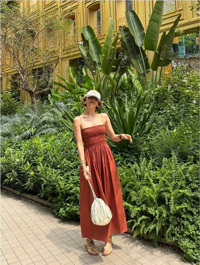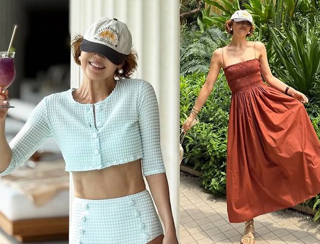 세련된 수영복 위에 카디건을 덧입은 리조트룩은 실용성과 스타일을 모두 챙긴 최은경표 비치룩이었습니다.