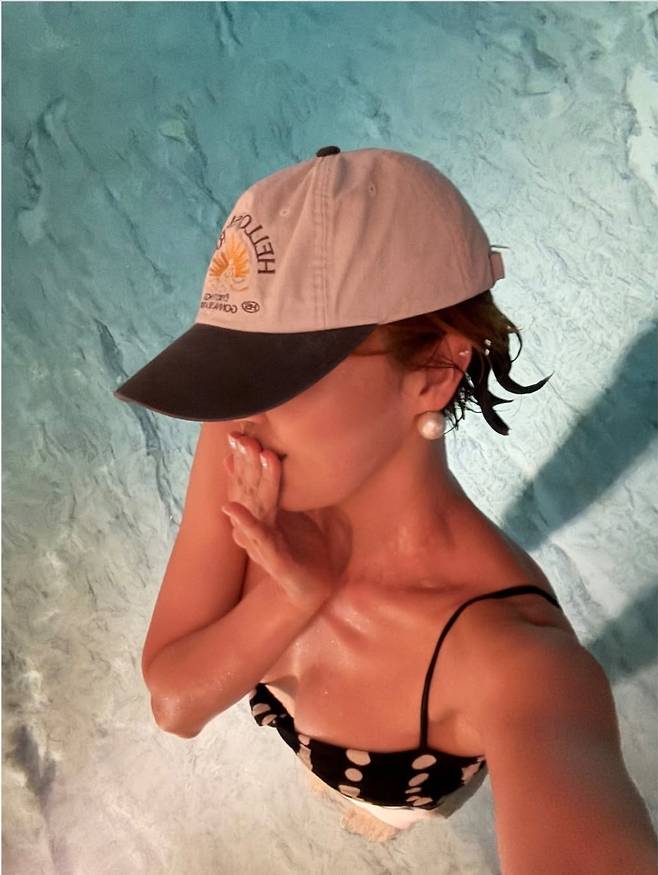 진주 귀걸이와 볼캡, 시원한 보랏빛 칵테일까지 더해져 여유로운 휴양지 감성을 완성했습니다.