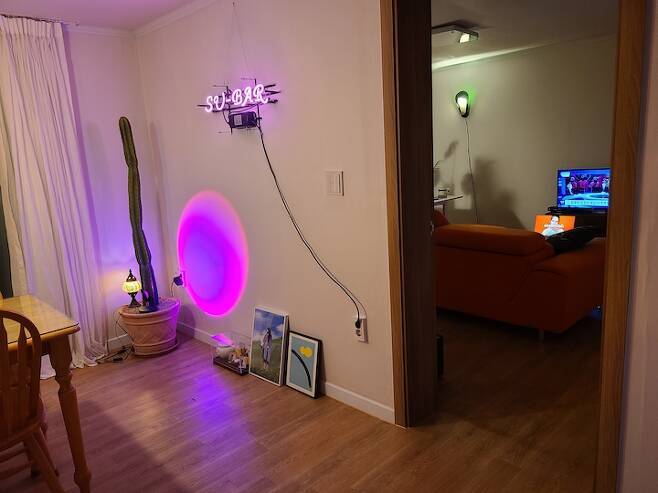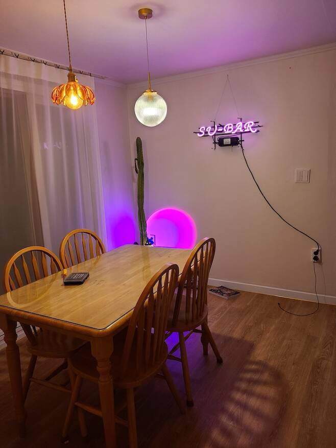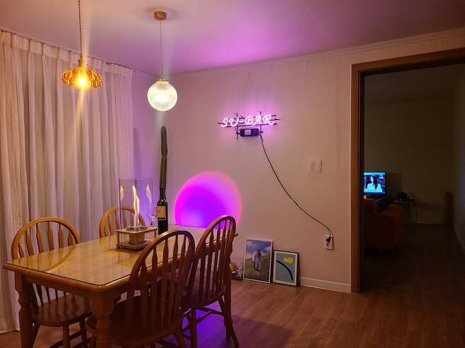 이곳은 거실 공간인데 네온사인 아래에 수납장 하나 이쁜 걸 두고 싶은데 아직도 마땅한 걸 찾지 못해서 고민 중이랍니다! 얼른 딱 내 거다 하는 가구가 나왔으면 하는 소망이 있어요. 식탁은 저희 본가에서 20년 전에 구매해서 사용했던 식탁인데 디자인이 너무 심플해 아직까지 사용해도 전혀 촌스럽지 않고 만족스럽게 사용하고 있는 중이에요~