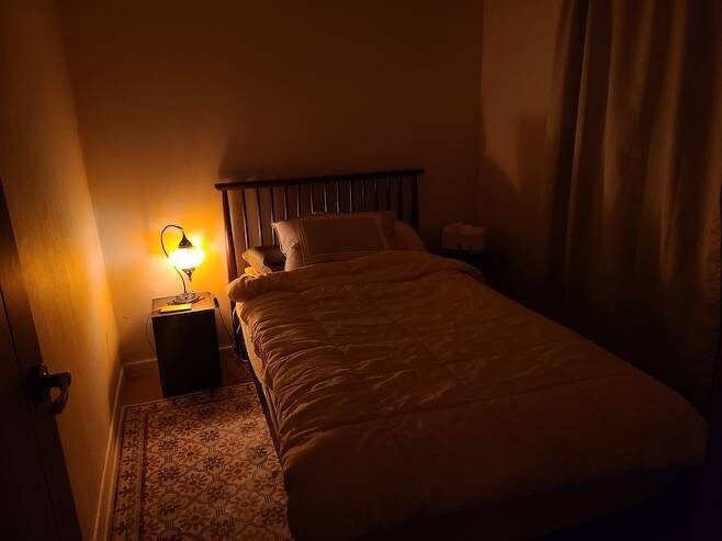 침실 공간은 딱 침대만 둬서 수면에 최적화하기로 결정했어요. 침실은 숙면에만 집중하길 원하는 공간으로 처음부터 계획하고 있었기 때문에 제가 잠에 조금 예민한 편이라 정말 조용하게 어둡게 한 상태로 잠을 청해야 해서 조명, 침대만 두고 암막 커튼을 달았더니 아늑하고 좋습니다.