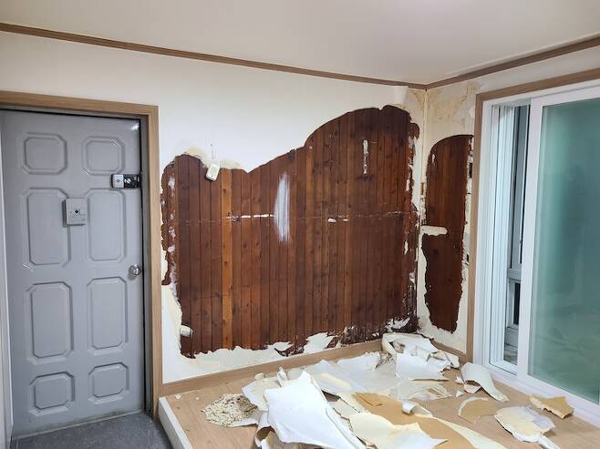 이곳은 거실입니다. 진짜 오래된 집이라는 것을 증명하듯... 도배를 뜯어내니 나무 벽이 등장했어요. 사실 너무 빈티지하고 이뻐서 살릴까도 고민을 했는데 이미 샷시, 몰딩까지 현대식으로 고쳐져있는 상태이기도 했고 오랫동안 도배지로 숨겨져있었던 나무 벽이라.. 관리가 되질 못해서 ㅠㅠㅠ 울면서 도배로 다시 막기로 결정을 했습니다. 미리 알았더라면! 살렸을 거예요!