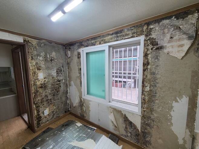 이전 세입자분이 나가고의 상태에요. 진짜 답이 안 나오는 상황이었습니다. 그동안 환기도 잘 안된 것은 물론이고 오래된 빌라이니깐... 그러려니 해도 까면 깔수록 상태가 너무 안 좋아서 세입자분이 나가고 2주 동안은 곰팡이 제거를 직접하고 약처리도 하고 통풍을 계속 시키면서 곰팡이 잡는 것을 1순위로 두었어요.