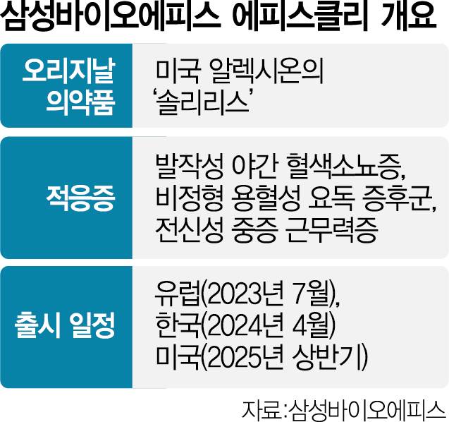 에피스클리는 미국 알렉시온이 개발한 희귀질환 치료제 솔리리스의 바이오시밀러다. 솔리리스는 의료 현장의 미충족 수요가 큰 대표적인 초고가 바이오의약품이다. 미국에서 발작성 야간 혈색소뇨증(PNH) 치료를 위한 연평균 투약 금액이 약 52만 달러(약 7억 6000만 원)에 이르는 것으로 알려져 있다.