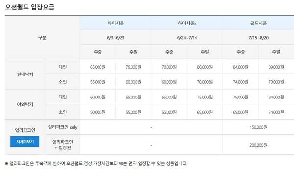 골드 시즌(7/15~8/20) 주중에는 실내락커를 대인 84,000원, 소인 74,000원에, 야외락커를 대인 79,000원, 소인 69,000원에 이용할 수 있습니다. 한편 주말에는 실내락커를 대인 89,000원, 소인 79,000원에, 야외락커를 대인 84,000원, 소인 74,000원에 이용 가능합니다. 소인 기준은 36개월 ~ 초등학생이며, 보호자 동반 입장해야 합니다.