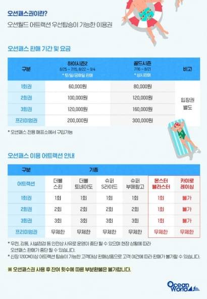 오션패스 티켓은 구매 당일에만 사용 가능하며, 슈퍼 부메랑고, 슈퍼 S라이드, 더블 스핀, 더블 토네이도는 무제한 우선 탑승 가능하고, 몬스터 블라스터는 오전 또는 오후에 1회만 우선 탑승 가능합니다. 조기 입장 마감 시 탑승이 제한될 수 있으며, 골드시즌 내 선착순으로 한정 판매된다는 점 참고 바랍니다.