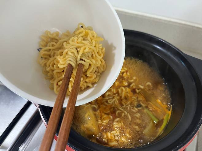 그다음 면을 넣고 3분 30초 끓이세요. 원래 조리 시간인 4분 30초보다 1분 덜 끓입니다.