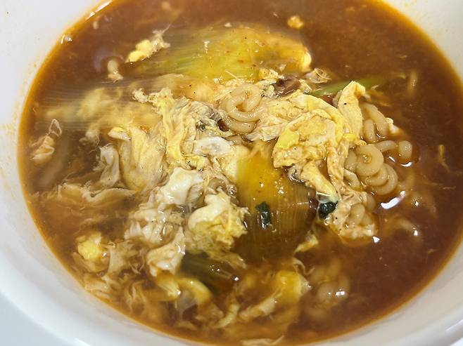 계란이 몽글몽글 부드럽게 익으면 불을 끄고 그릇에 국물을 따르세요.