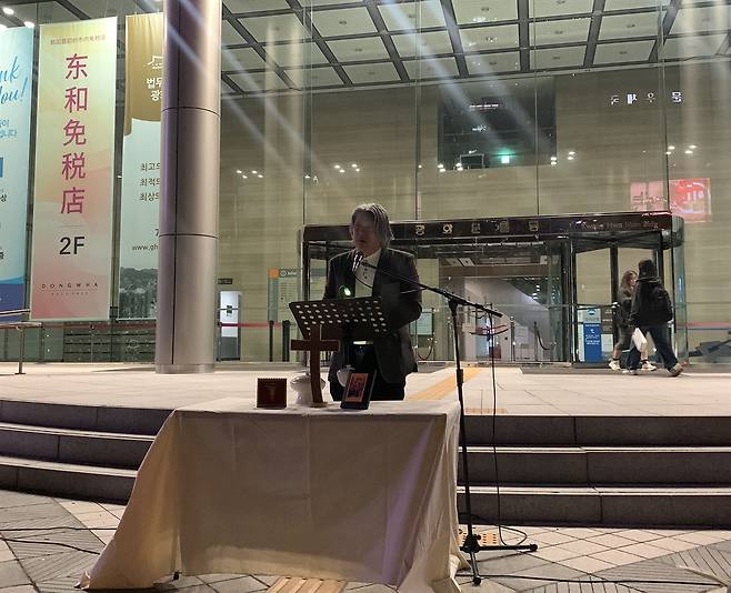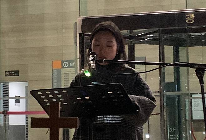 | ▲ 장예정 차별금지법제정연대 공동집행위원장이 기도를 하고 있다. |