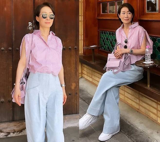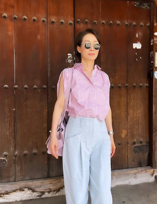 나영희는 핑크 스트라이프 셔츠로 경쾌하면서도 단정한 분위기를 연출했습니다.