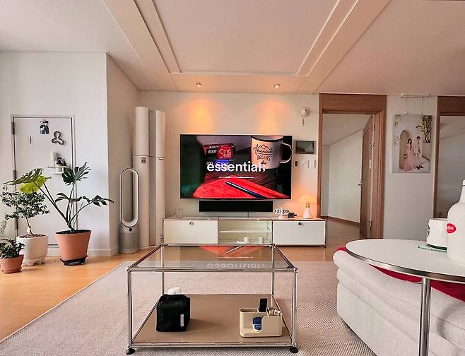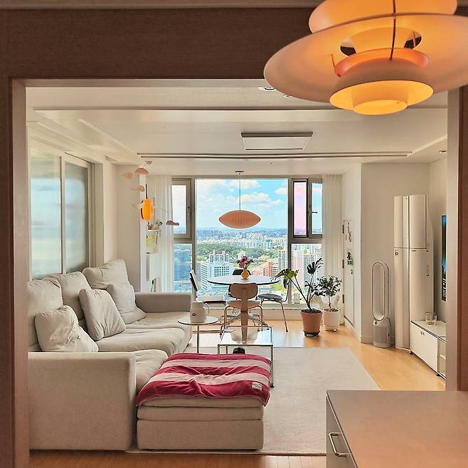 그럼 먼저 거실부터 둘러볼까요? 이곳은 저희 부부가 영화와 드라마를 시청하며 매끼 저녁을 먹는 공간입니다. 큰 통창을 바라보며 남편과 혹은 손님들과 저녁 시간을 보낼 수 있는 편안한 공간으로 꾸몄어요.