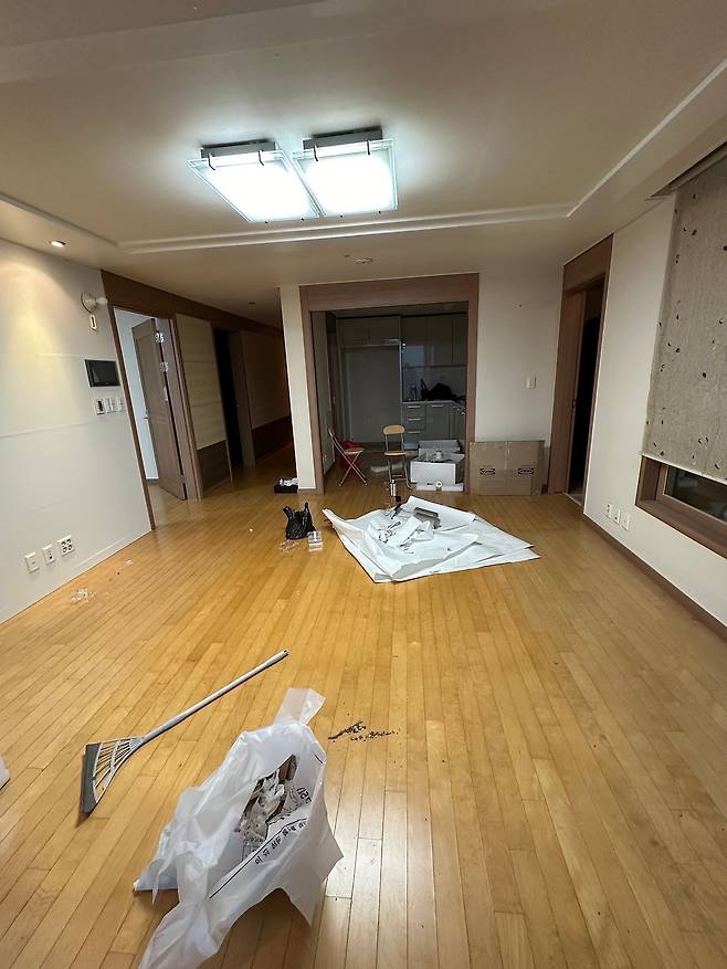 이 집은 2007년에 지어져서 연식이 꽤 된 집이라 어두운 브라운 칼라의 몰드들과 낡은 벽지들이 많이 보였어요. 그 덕에 한눈에 보아도 어둡고 칙칙했습니다. 대신 이 집의 장점은 뷰가 뻥 뚫렸다는 것과, 통창이 있다는 거였는데요. 대신 통창이 내부에 설치되어 있어 약간은 답답해 보였습니다. 이외로 폭이 좁은 마루도 마음에 들지 않았지만 너무 큰 시공은 원치 않아 마루는 그냥 두기로 했습니다.