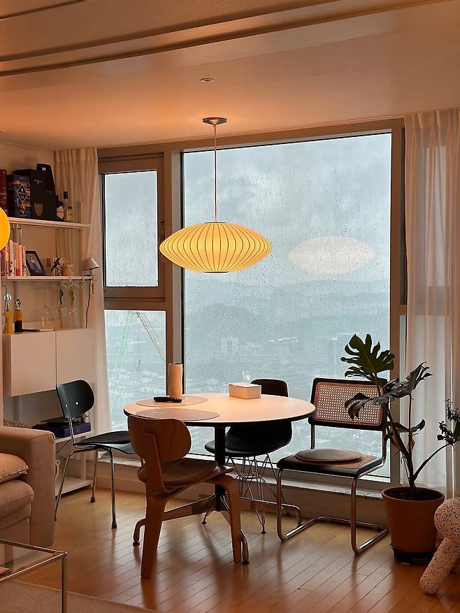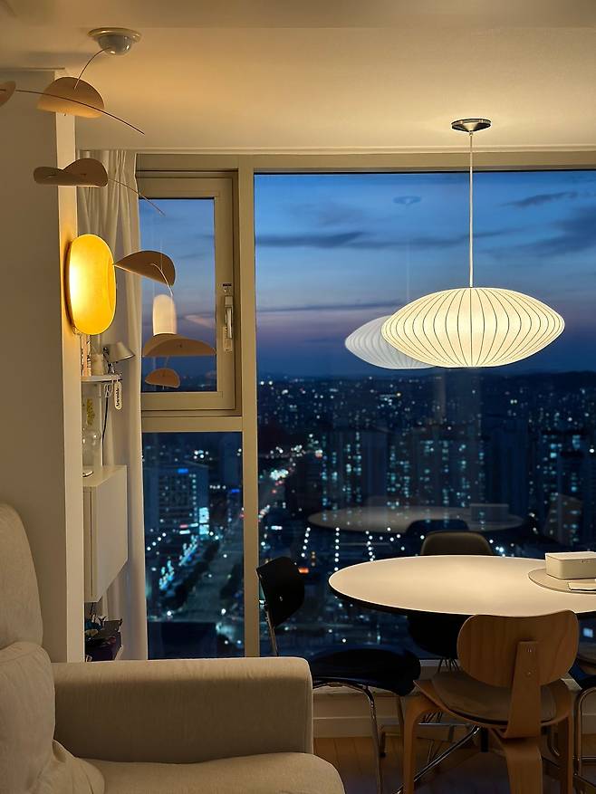 제가 가장 신경 쓴 공간은 거실 다이닝 공간입니다. 손님들을 초대해서 먹고 노는 것을 즐기는 저희 부부는 큰 통창을 제대로 활용하고자 다이닝 테이블을 거실 창가에 두었습니다. 원형 테이블과 잘 어울리는 둥근 조명은 밤에 보면 더욱 빛을 발합니다. 저녁에 맥주 한 잔을 꼭 하는 남편이 가장 좋아하는 공간이기도 해요! 집에 놀러 오시는 모든 손님들이 야경을 즐기며 좋아해 주시는 공간입니다.