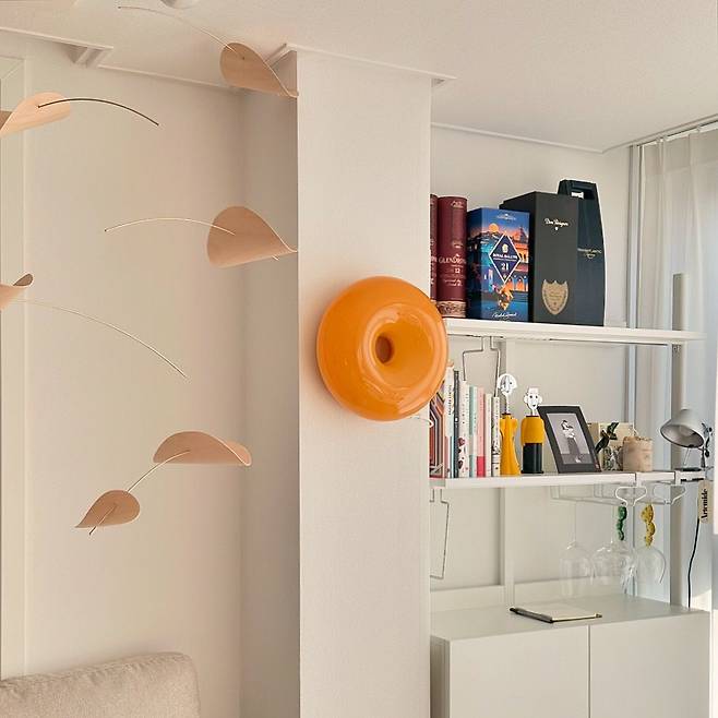 이 사진에서는 남편의 홈바 공간이 한눈에 보이네요. 와인 오프너 등, 포인트가 되는 오브제를 두어 장식해 보았습니다. 그 옆으로는 제가 좋아하는 원형 조명을 달아 특별한 분위기를 냈어요.