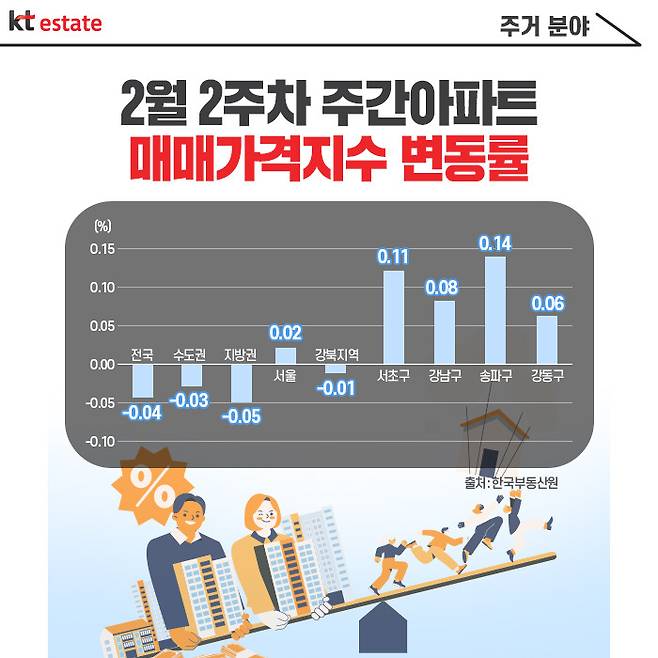 반면 서울시의 경우, 2월 1주차에 이어 2주차에도 0.02%를 기록하는 등 2주 연속 상승세를 기록한 것이 눈에 띄는데요. 권역별로 보면, 2월 2주차 기준으로 강북 지역의 경우 -0.01%를 기록하며 하락세를 나타냈으나, 강남 지역은 0.05% 상승률로 서로 대비되는 모습을 보였습니다.