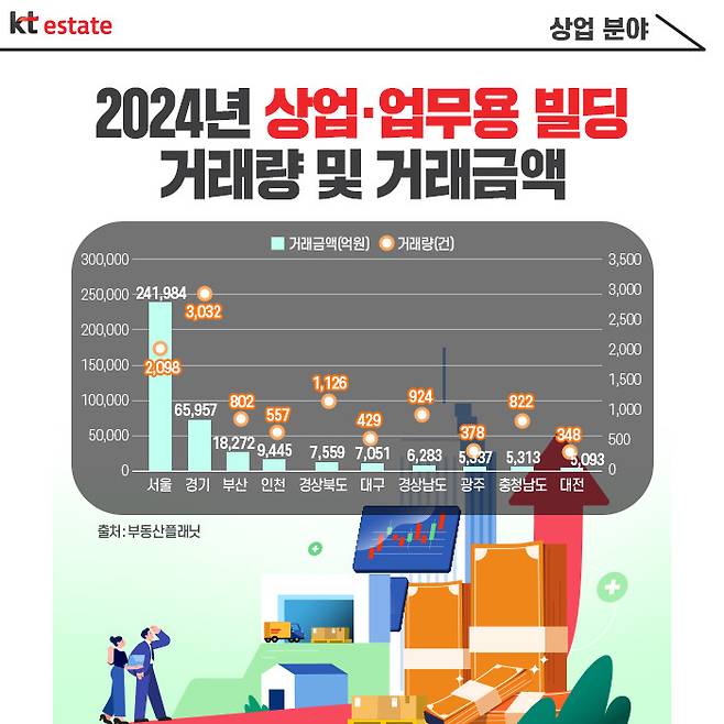 상업용부동산에서는 지난해 거래 금액이 크게 늘었습니다. 상업용부동산 프롭테크 기업 부동산플래닛에 따르면, 2024년 상업·업무용부동산(상업·업무용 빌딩, 상가·사무실)은 5만3578건으로 2023년 5만4288건보다 1.3% 감소했으나, 거래금액은 54조6705억원을 기록하며 전년 43조3580억원보다 26.1%나 증가한 것으로 나타났습니다.
