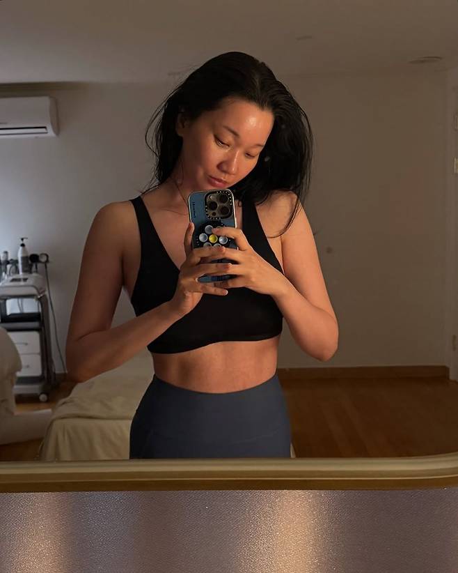 또 다른 룩에서는 심플한 블랙 브라탑과 하이웨이스트 팬츠로 클래식한 스포티 무드를 연출했다. 이때 볼륨감 있는 실루엣과 슬림한 허리라인이 자연스럽게 돋보인다.