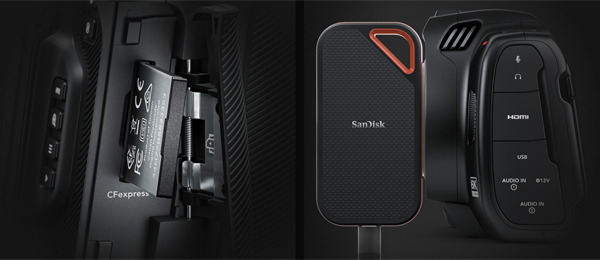 BMCC 6K는 CFast 2.0을 썼던 기존 BMPCC 6K 시리즈와 달리 더욱 빨라진 CFexpress Type B 고속 메모리 카드를 지원하여 풀 해상도의 12비트 BRAW(Blackmagic RAW) 파일을 녹화하는데 적합하다. 또한 기존처럼 외장 플래시 미디어 또는 SSD에 직접 녹화할 수 있는 USB-C 확장 포트도 제공하고 있다.