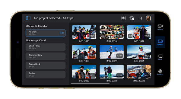 미디어(Media) 탭에는 클립을 훑어보고 빠르게 검토 및 검색, 정렬하고 미디어 업로드 상태 정보를 확인하는데 필요한 모든 컨트롤이 포함되어 있다. 또한 휴대폰 사진 폴더에 접속해 클립을 블랙매직 클라우드로 업로드 할 수 있다. 모든 클립(All Clips) 폴더에 있는 미디어에 접속하면 저장된 각 클립의 썸네일을 볼 수 있다. 블랙매직 클라우드를 통해 블랙매직 클라우드 스토리지로 전송하거나 직접 프로젝트 라이브러리로 업로드할 클립을 선택할 수도 있다.