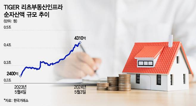 8일 한국거래소에 따르면 TIGER 리츠부동산인프라의 순자산액은 지난 7일 기준 4310억원으로 1년 전(2400억원)보다 약 80% 증가했다. TIGER 리츠부동산인프라의 주당 가격은 4400원 선이다.