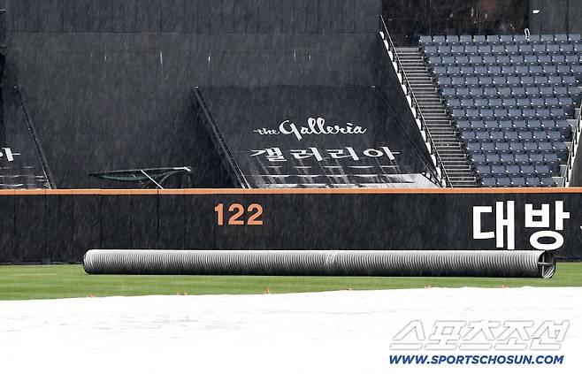 [대전=스포츠조선 정재근 기자] 갑작스러운 비 때문에 경기장에 방수포가 깔렸다.