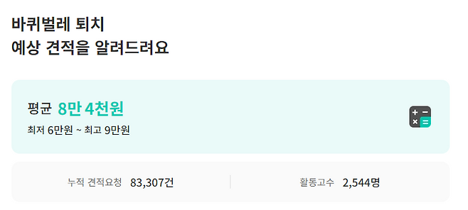숨고 내에서 거래되는 바퀴벌레 퇴치 평균 비용은 건당 8만 4천 원입니다. 최저 비용은 6만 원, 최고 비용은 9만 원으로 책정되어 있어요.