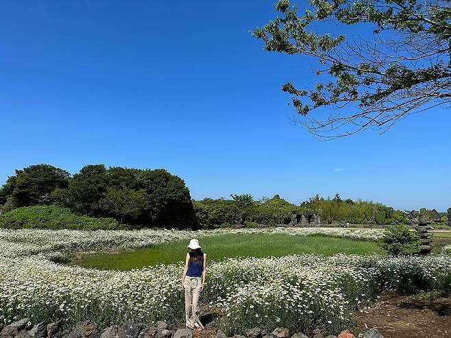 흰색 데이지가 만개한 들판에서 린아는 편안하면서도 세련된 스타일을 연출하고 있다. 네이비 민소매 톱에 베이지 컬러의 와이드 팬츠를 매치한 룩으로 여름의 자연스러운 매력을 강조했다. 화이트 버킷햇으로 포인트를 주어 실용성과 스타일을 동시에 잡았으며, 자연과 어우러지는 톤온톤 컬러 조합이 돋보인다.