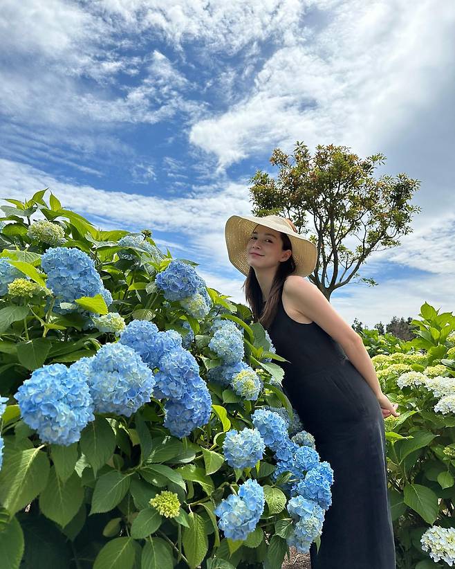 파란 수국이 만개한 정원에서 린아는 블랙 슬리브리스 원피스로 우아함을 연출하고 있다. 와이드 브림 스트로 햇은 여름 햇살을 가리는 실용성과 함께 로맨틱한 무드를 더했다. 수국의 블루 톤과 대조를 이루는 올블랙 스타일링으로 세련되고 시크한 분위기를 완성했다.
