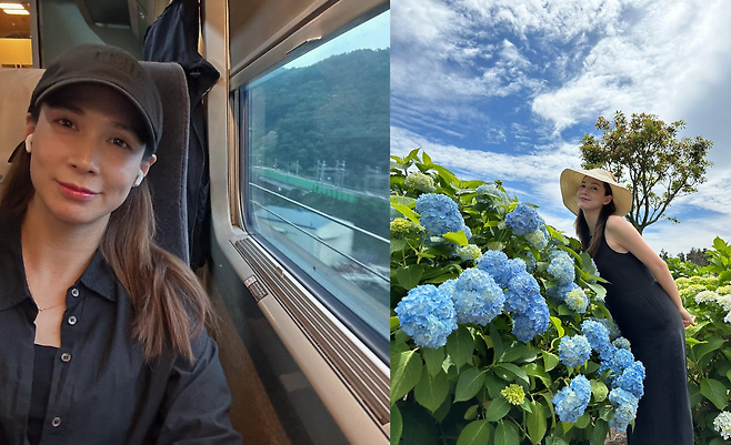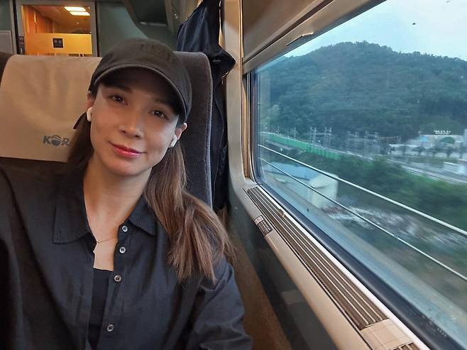 KTX 기차 안에서 린아는 편안한 여행 스타일을 선보이고 있다. 다크 그레이 캡과 블랙 카라 셔츠의 조합으로 깔끔하면서도 활동적인 룩을 연출했다. 미니멀한 컬러 팔레트로 여행의 편안함과 스타일을 동시에 잡은 실용적인 패션이 인상적이다.