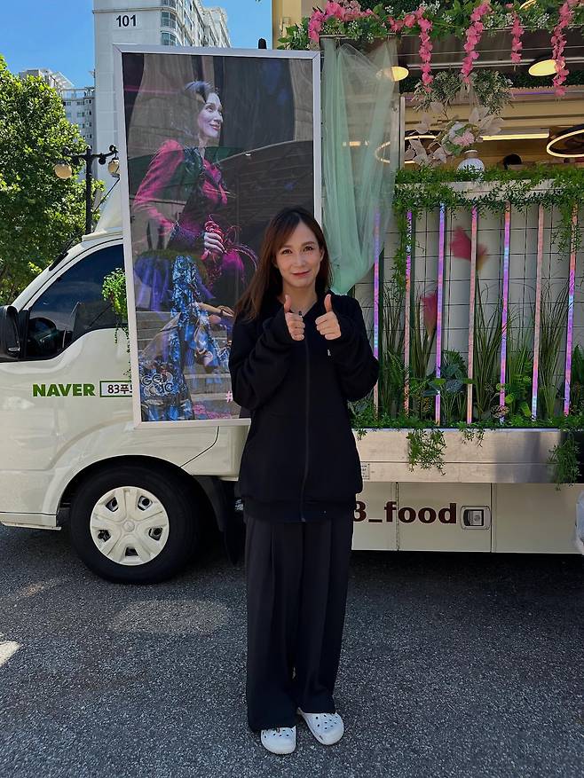 뮤지컬 포스터가 부착된 푸드트럭 앞에서 린아는 캐주얼한 매력을 발산하고 있다. 블랙 후드집업에 와이드 팬츠, 화이트 크록스로 완성한 스포티 캐주얼 룩이다. 양손 엄지척 포즈와 함께 친근하고 활기찬 이미지를 연출하며, 편안함을 우선시한 실용적인 스타일링을 보여주고 있다.