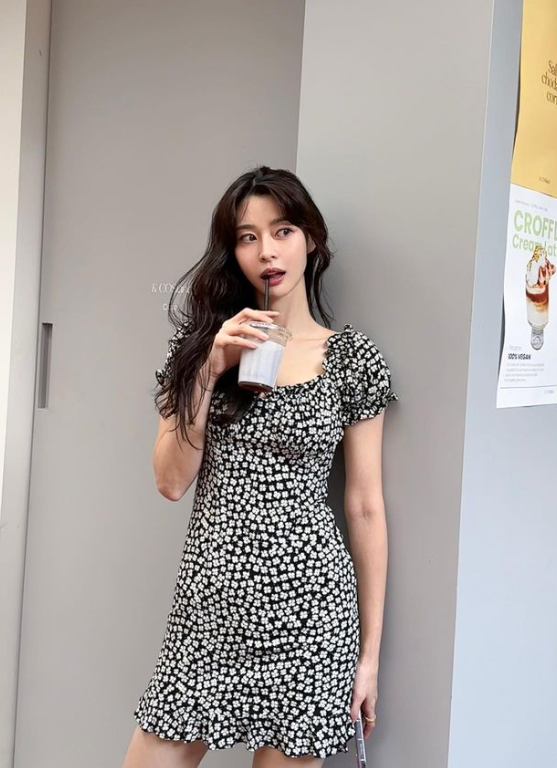 권나라는 퍼프소매가 귀여운 슬림핏 원피스로 데일리로 입을 수 있는 꾸안꾸룩을 선보였다.
