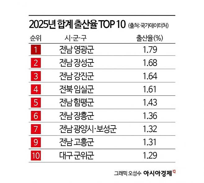 지역별로 보면 광역 17개 시도 중 전남이 합계 출산율 1.10으로 가장 높았다. 시군구 단위로 들여다보면 전남 영광군이 합계 출산율 1.79를 기록, 7년 연속 1위를 차지했다. 영광군뿐만 아니라 장성군(1.68명, 2위), 강진군(1.64명, 3위) 등 전국 출산율 상위 10개 시군구 중 8곳이 전남의 기초자치단체였다. 상위 10위 중 전남이 아닌 곳은 전북 임실군(1.61명, 4위)과 대구 군위군(10위, 1.29명) 등 2곳이다.