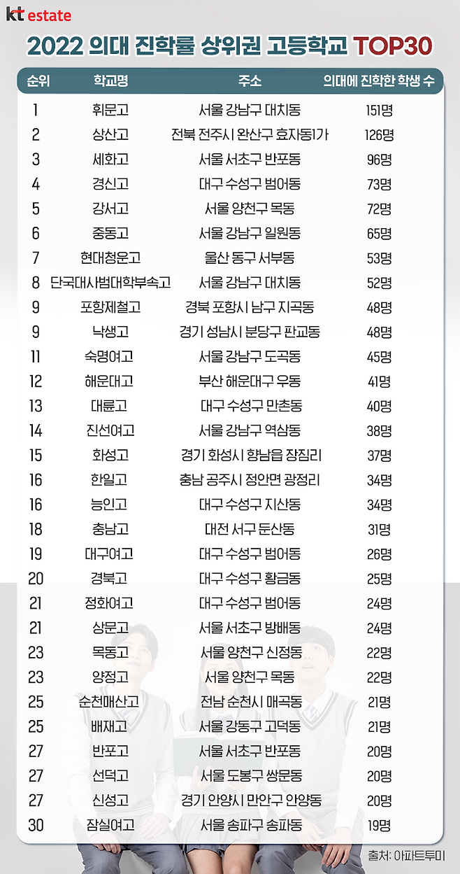 KT에스테이트가 아파트 실거래 분석 사이트 ‘아파트투미’에 올라온 의대 진학률(2022년 기준) 상위 30개 고등학교를 찾아본 결과, 지난해 의대를 가장 많이 보낸 학교는 서울 강남구 대치동 휘문고로 나타났습니다. 강남의 대표 명문사학인 휘문고는 지난해 151명의 의대생을 배출하며 의대 입시의 최강자로 떠올랐는데요. 그동안 의대 입시의 강자로 불리던 전북 전주시 상산고는 126명을 기록하며 2위에 올랐습니다.