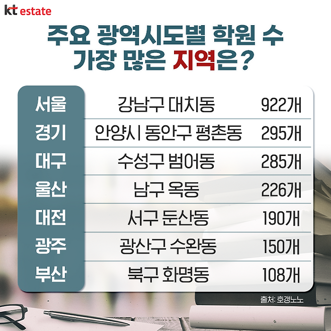 그렇다면 서울에서 가장 학원 수가 많은 곳은 어디였을까요? 프롭테크 기업인 호갱노노의 학원가 수를 단순 비교해본 결과, 서울 강남구 대치동이 922개로 1위를 차지했습니다. 대치동은 명문대 진학률이 높은 학교가 많을 뿐 아니라 우수 학원가를 갖춰 대한민국 사교육 1번지로 명성이 자자한 곳인데요. 다음으로 경기에서는 안양시 동안구 평촌동이 학원 수 295개로 경기 지역 1위에 올랐습니다. 평촌동은 대치동을 제외하면 전국에서 학원이 가장 많은 곳으로 ‘평촌 학원가’라는 특수상권이 형성돼 수요층이 탄탄한 곳입니다.