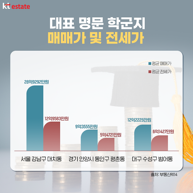 그렇다면 명문 학군의 집값은 어떨까요? 이들 학군이 좋은 지역은 집값도 강세를 보이고 있습니다. 먼저 서울 강남구 대치동은 의대 합격자 수가 가장 많았던 휘문고가 위치하고 있으며, 우리나라 사교육의 중심인 곳인데요. 지난해 평균 매매가는 28억9292만원이었으며, 평균 전세가는 12억9583만원으로 조사됐습니다(출처: 부동산R114).