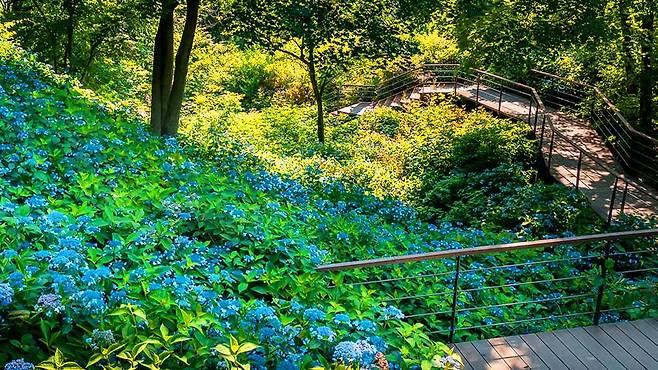은은한 푸른빛을 머금은 산수국부터 부케처럼 풍성하게 피어난 큰잎수국까지, 걷는 걸음마다 새로운 감탄이 이어진다. 사진을 찍기에 완벽한 배경은 덤이다.