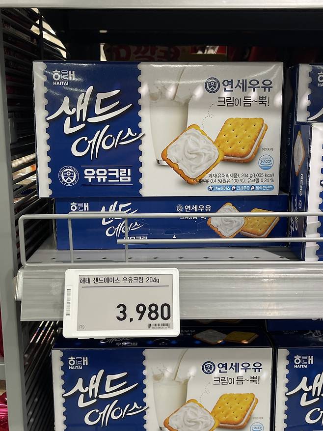 고소한 밀크 크림이 가득한 샌드에이스의 부드러운 우유 버전으로 바삭한 비스킷 사이에 진한 우유 풍미가 느껴지는 크림이 조화를 이뤄요.