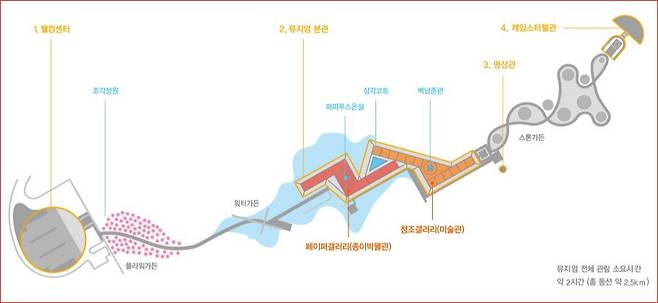 뮤지엄산의 첫인상은 ‘걷는 길 자체가 하나의 전시’라는 점입니다. 웰컴센터에서 시작해 플라워가든, 워터가든, 본관, 스톤가든, 명상관, 그리고 제임스터렐관까지 이어지는 길은 약 700m에 달합니다. 초입부터 끝까지 다 둘러보면 최소 1.4km 이상 걸어야 하기 때문에, 편안한 운동화를 꼭 챙기시는 게 좋아요.