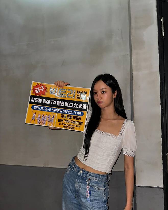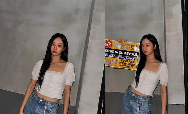 사진 속 혜리는 화이트 스퀘어넥의 크롭 블라우스와 청바지를 입고 긴 생머리를 자랑하며 영화 홍보에 직접 나섰다.