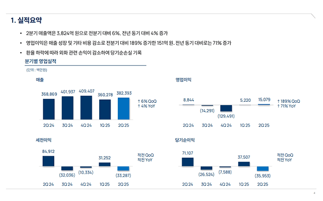 엔씨소프트 2025년 2분기 매출은 3824억 원으로 전분기 대비 6%, 전년 동기 대비 4% 증가했다. 영업이익은 전분기 대비 189% 증가했고, 전년 동기 대비 71% 상승했다. 당기순이익은 적자 전환했다.