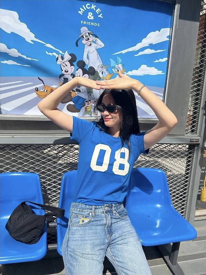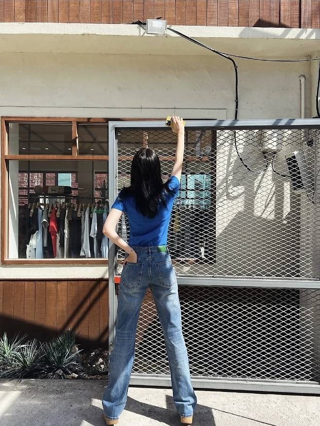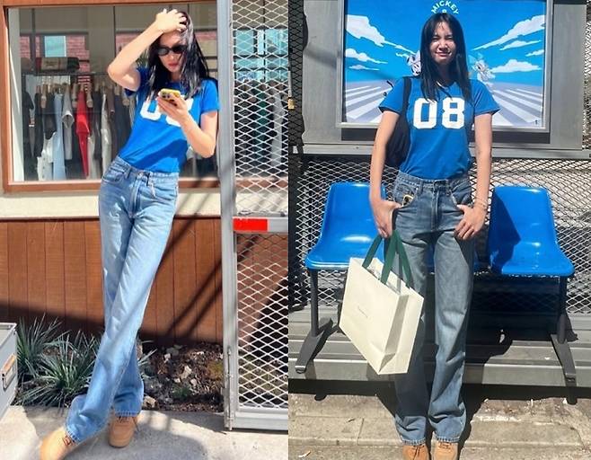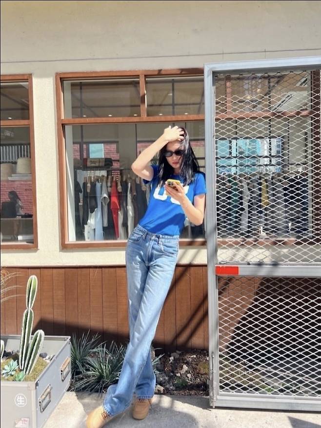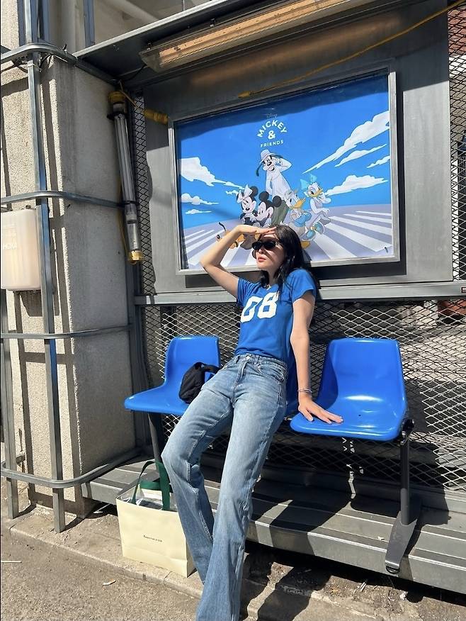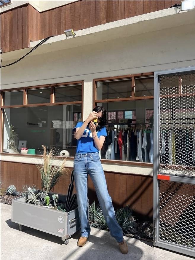 진아름은 비비드한 블루 컬러의 숫자 프린팅 티셔츠에 빈티지한 무드의 스트레이트 핏 데님 팬츠를 매치해 심플하면서도 스타일리시한 스트리트 무드를 완성했습니다.