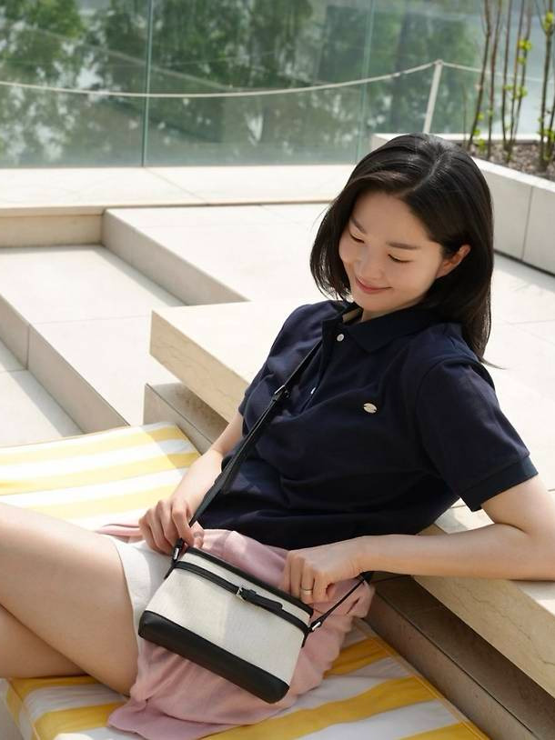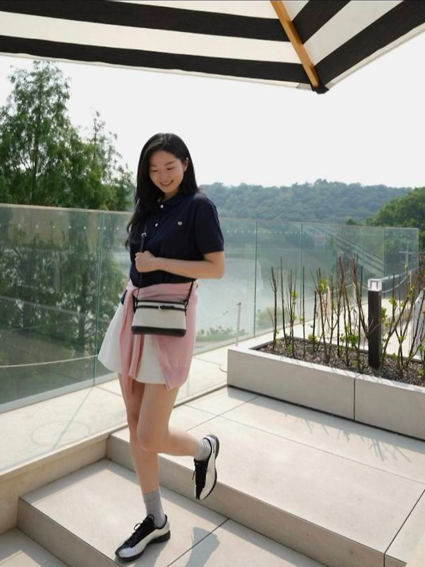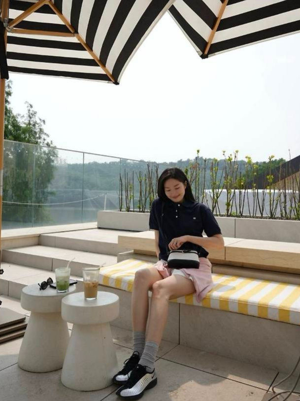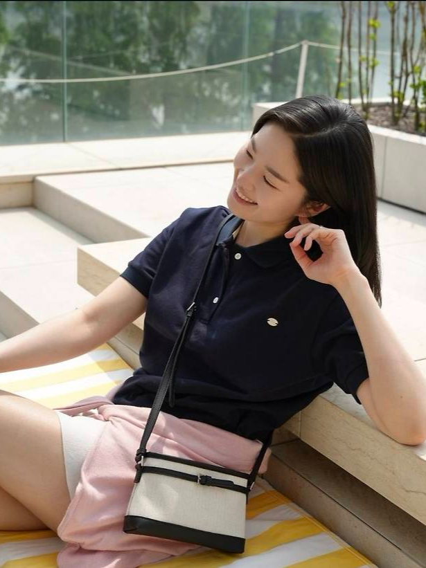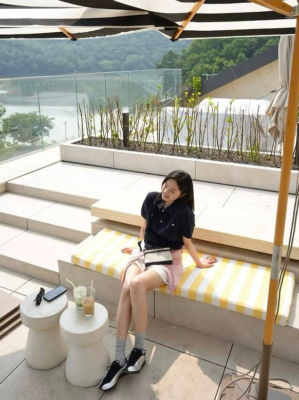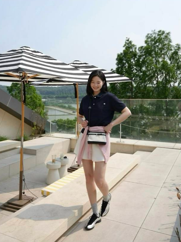 네이비 피케 티셔츠에 화이트 미니스커트를 매치해 심플하면서도 단정한 분위기를 연출했고, 허리에 가볍게 걸친 핑크 컬러의 스웻셔츠가 발랄한 포인트를 더했습니다.