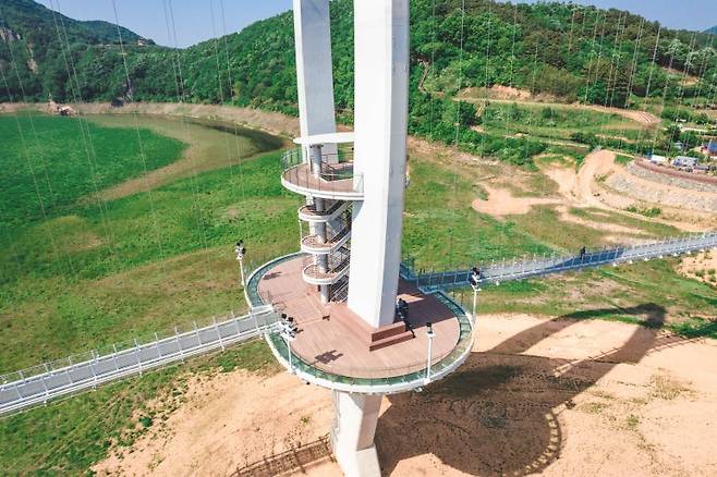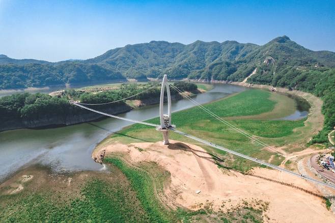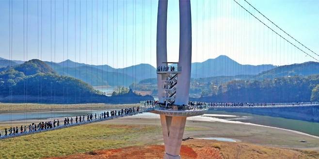 임실 옥정호에 자리한 출렁다리와 붕어섬은 자연과 인공이 조화를 이룬 이색 여행지다. 주말에는 전국에서 하루 평균 약 6천 여 명에 이르는 관람객이 몰리는 곳이다.