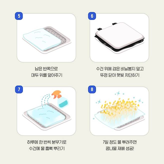 그다음 남은 수건 반 쪽으로 대두 위를 덮어주고, 검은 비닐봉지와 뚜껑으로 햇빛을 차단해주면 끝! 그리고 매일 하루에 한 번씩 분무기로 수건 위에 물을 흠뻑 뿌려주면, 7일 뒤 꼿꼿이 선 콩나물 다발과 조우할 수 있답니다.