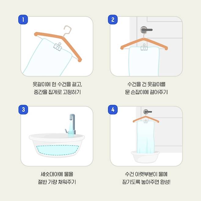 옷걸이와 집게로 수건을 고정시켜주고, 수건 끝부분이 세숫대야에 담긴 물에 찰랑찰랑 잠기도록 해준 뒤, 문 손잡이에 걸어주면 완성입니다.